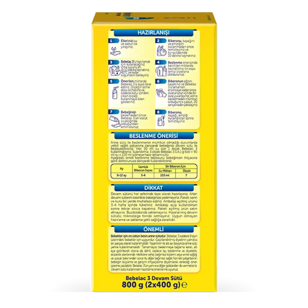 Bebelac 3 Devam Sütü, 9–12 ay arası bebeklerin büyüme ve gelişim döneminde ihtiyaç duyduğu besin öğelerini karşılamak üzere geliştirilmiştir. Prebiyotik lif karışımı (scGOS/lcFOS) içeriği sindirim sistemini desteklerken, D vitamini ve demir bağışıklık sistemine katkı sağlar.