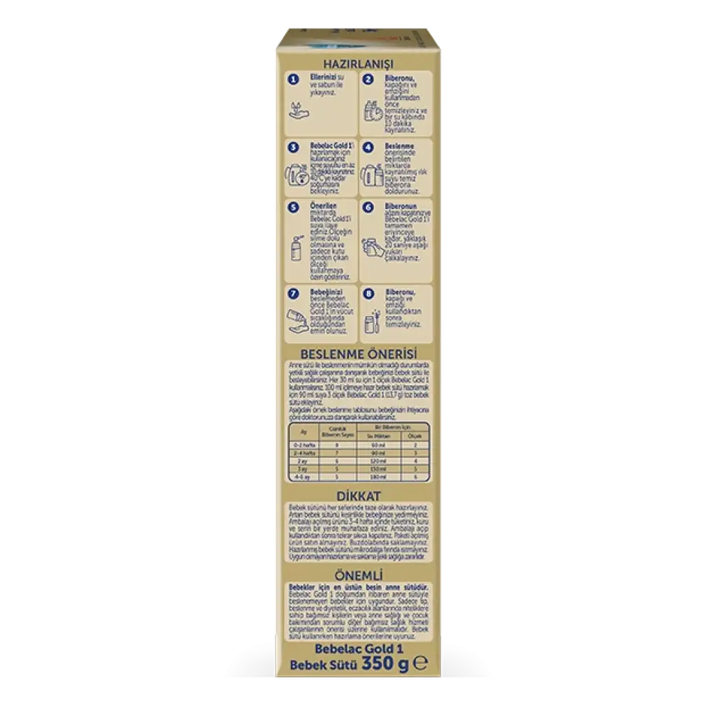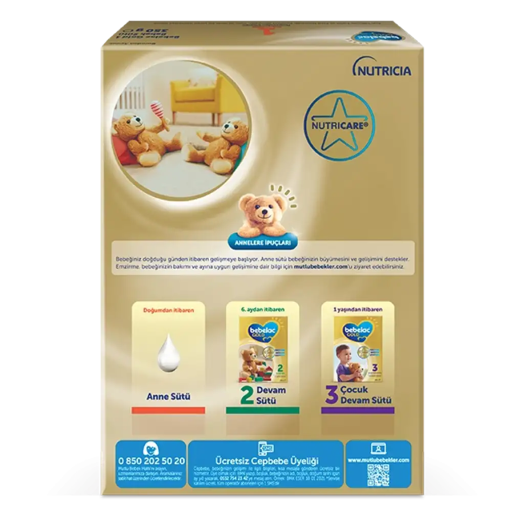 Bebelac Gold 1 Bebek Sütü, 0–6 ay arası bebeklerin sağlıklı gelişimi için anne sütüne yakın içeriğe sahip bir formüldür. Prebiyotik lif karışımı (scGOS/lcFOS) sindirim sisteminin düzenlenmesine ve bağışıklık sisteminin güçlenmesine katkı sağlar.