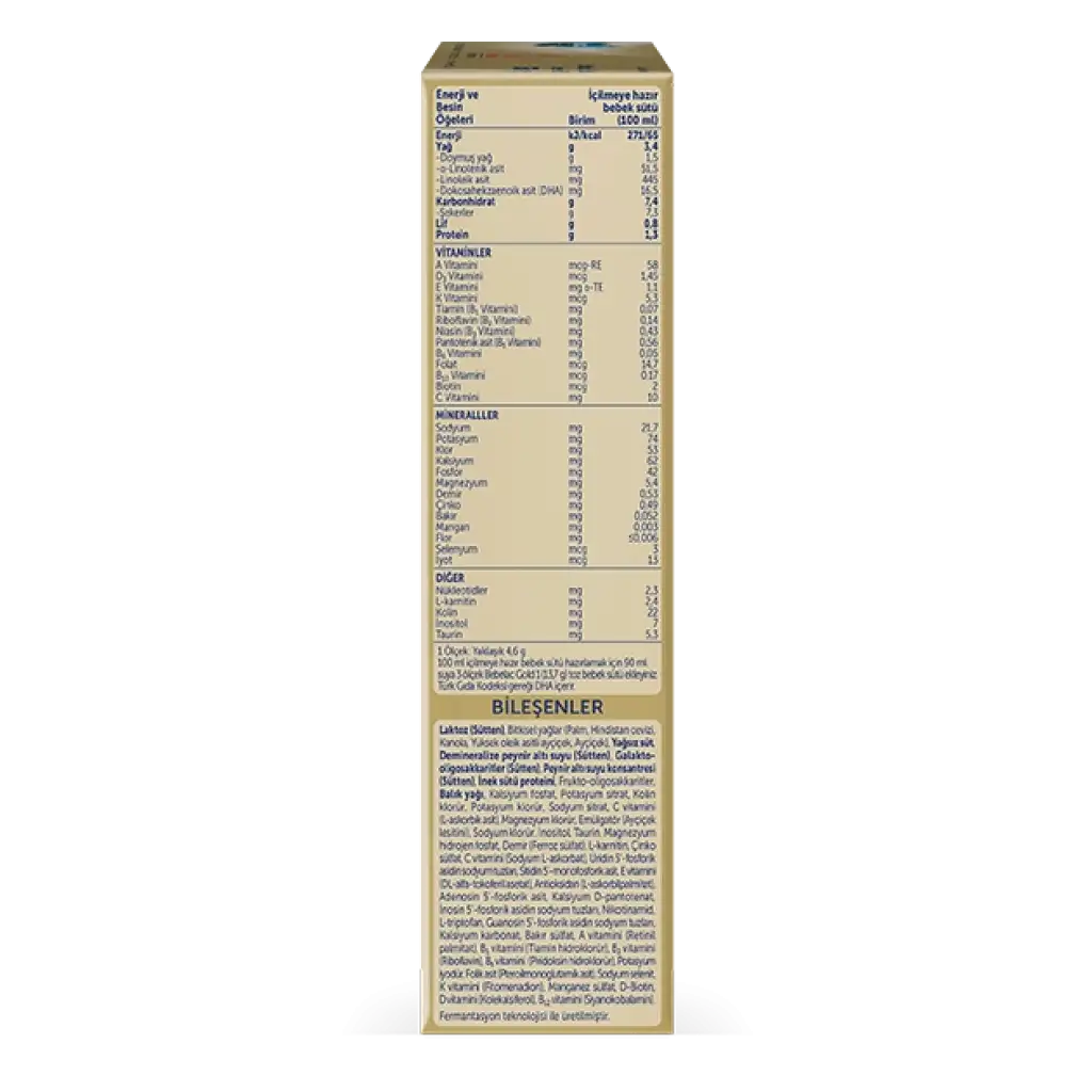 D vitamini, kalsiyum, demir ve çinko içeriğiyle kemik gelişimini destekler. Bebelac Gold serisinin zenginleştirilmiş formülü bebeğinizin büyüme döneminde ihtiyaç duyduğu besinleri sağlar.